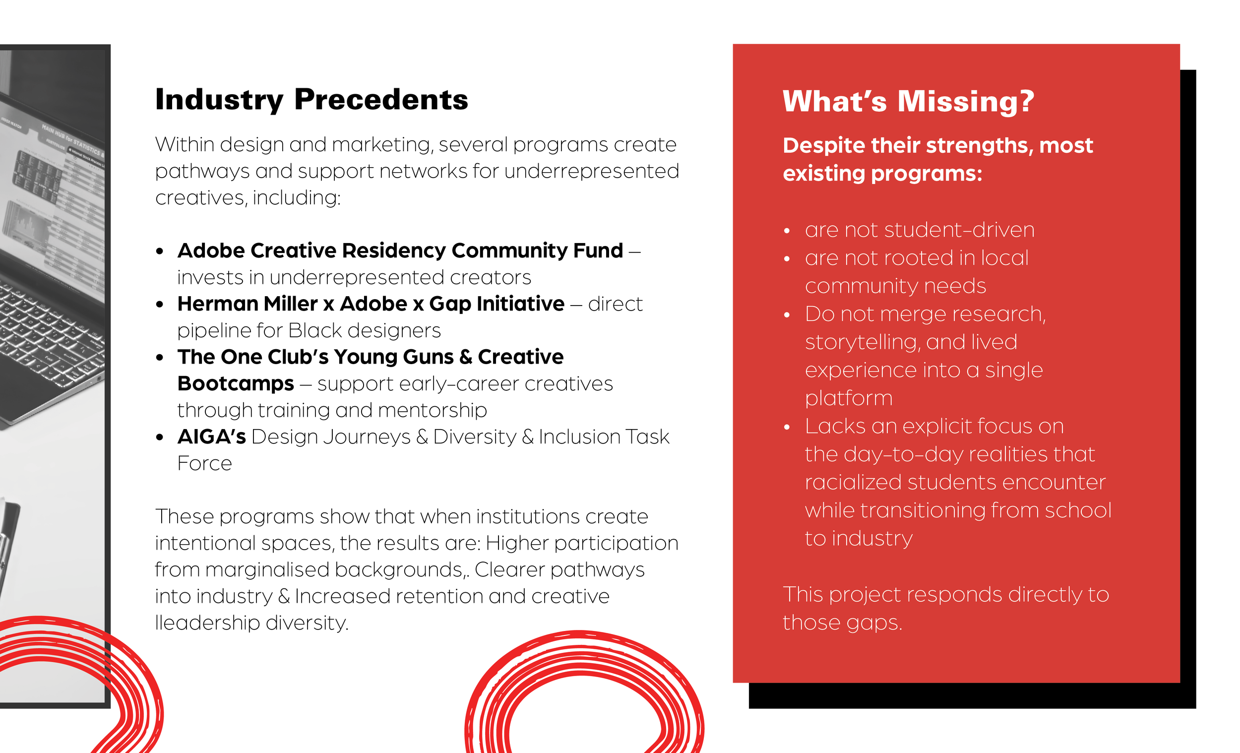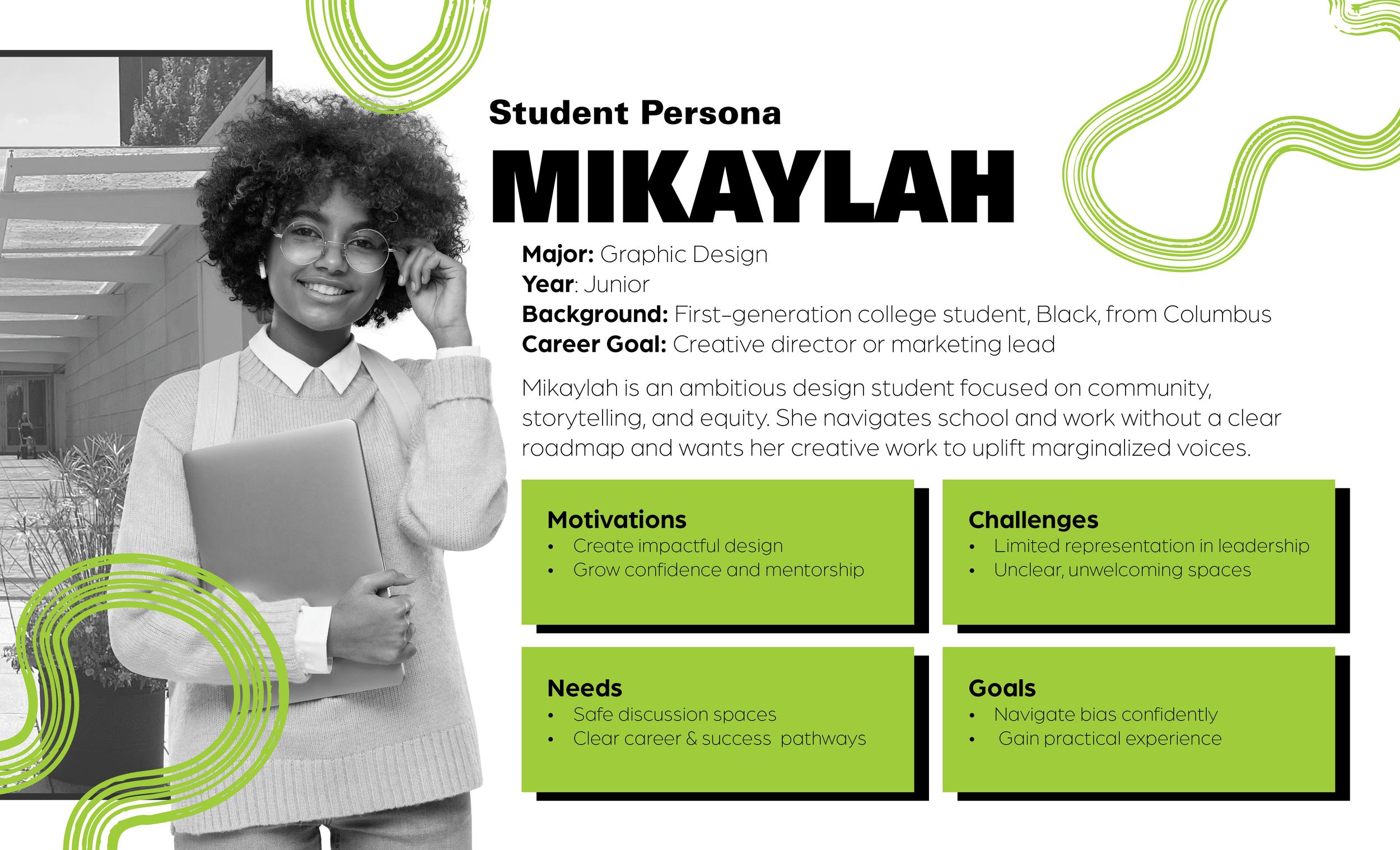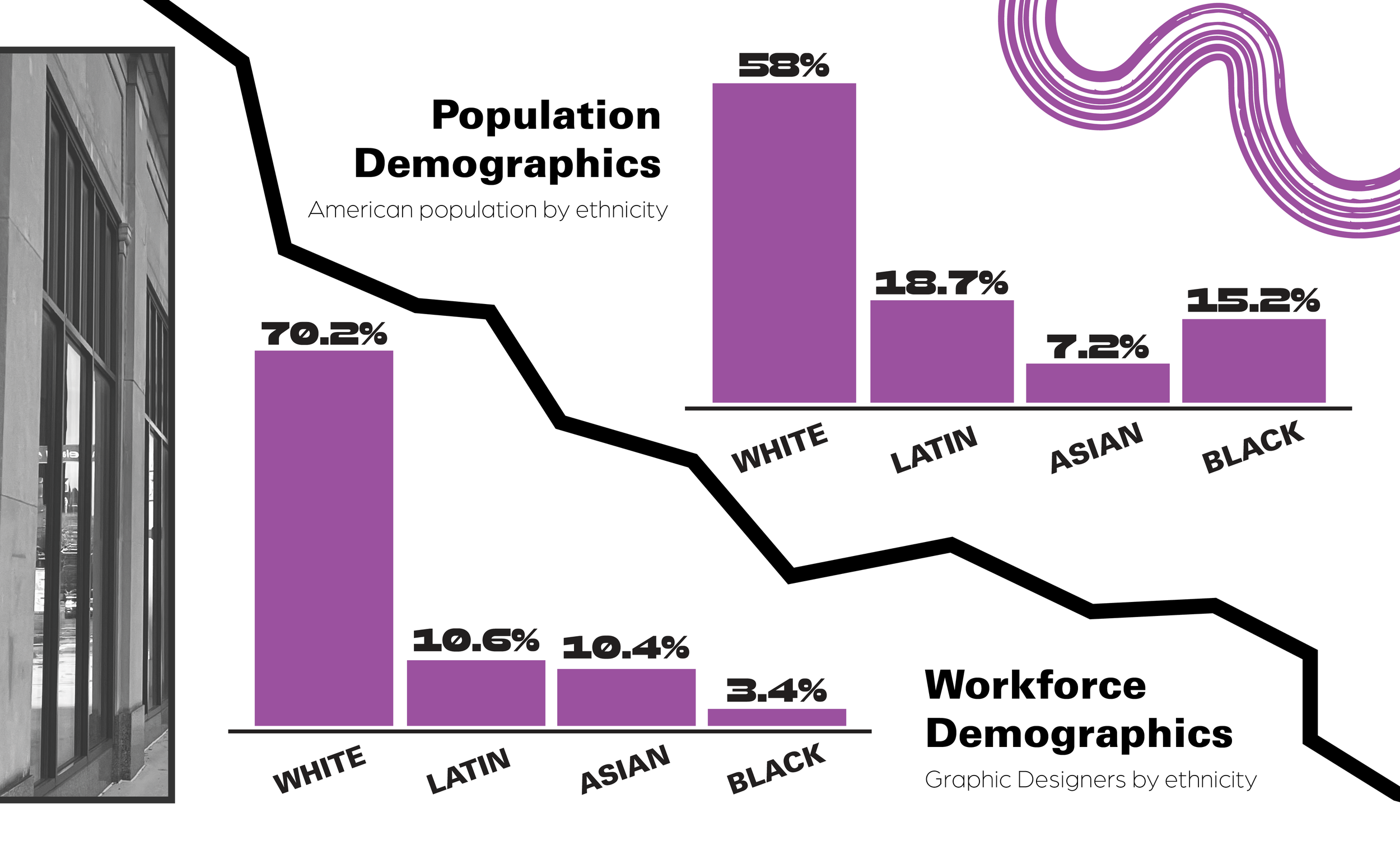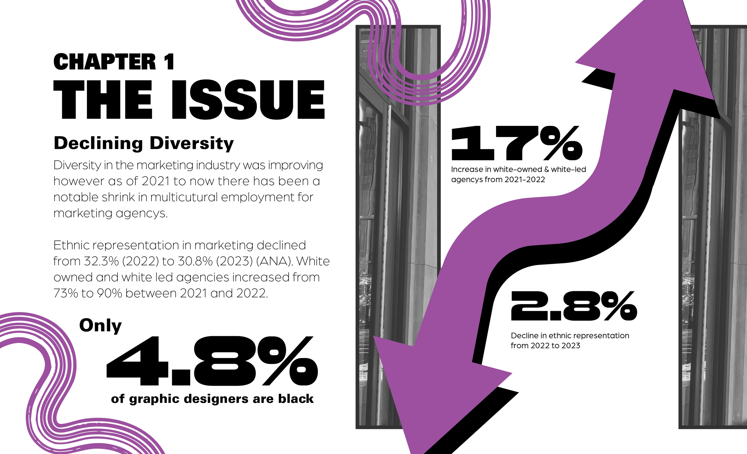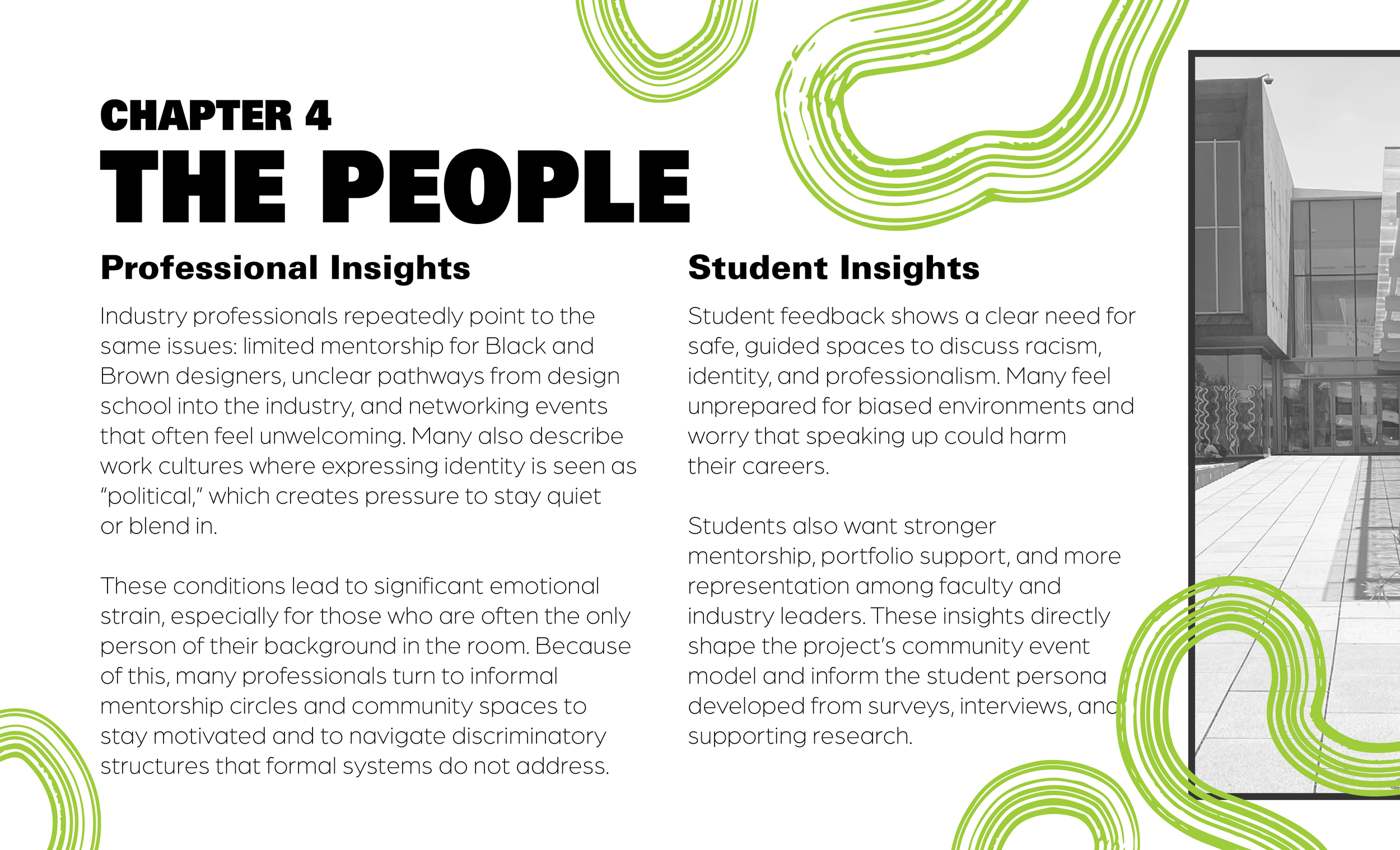 The first phase of my senior capstone explores the nuanced experiences of Black students in the design industry. This book translates my research into infographic-driven visual storytelling, illustrating the complexities of being a racialized designer and proposing actionable steps toward addressing the systemic pressures within the field. Featured below are selected spreads from the fully designed 22-page book that highlight the most relevant insights from the project.